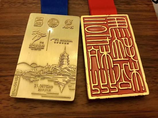 此次杭州马拉松完赛奖牌由西泠印社的大师专门定制,将西湖十景之一雷锋夕照和杭州马拉松字样印章结合,满满的文化范。另外完赛包内还包括香蕉一根,毛巾一块,尖叫饮料一瓶。