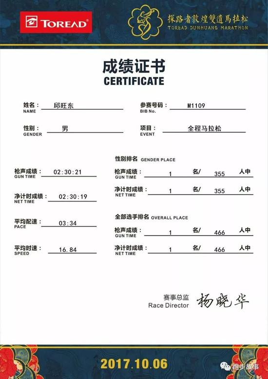 10月6日周五在敦煌双遗马拉松,他的对手包括今年武汉马拉松跑出2:23的前体制外第三李伟,还有在杨凌马拉松跑出2:25的西北师大学长兼训练伙伴王涛。