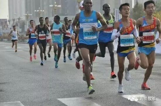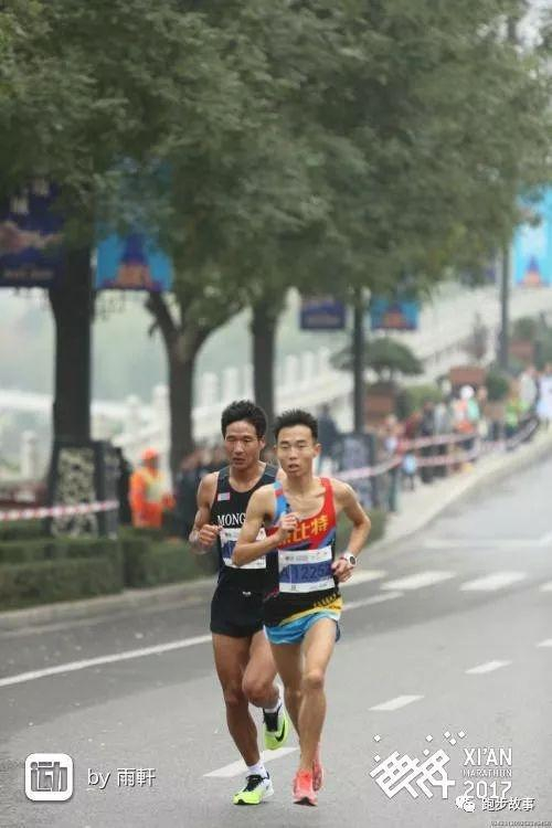 跑了一阵,他超过跟随那两个黑人大约4公里、跑半程的杨成祥。大约在七八公里处,一个蒙古特邀选手和跑半程的崔凯又追上他,三人于是就组成集团一起跑。