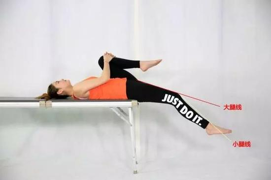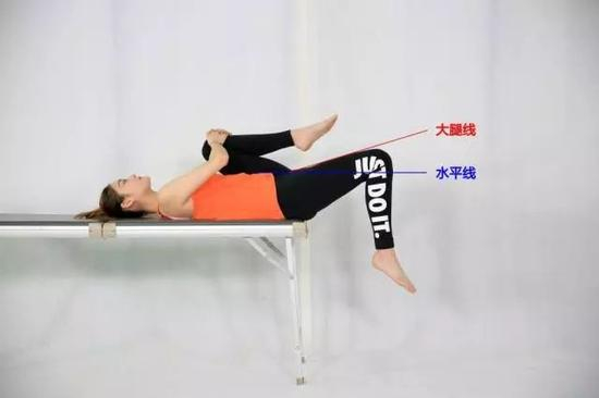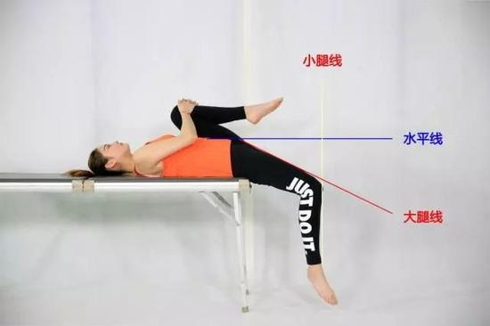 测试方法:该方法可综合测试下肢紧张度,但由于自己无法观察到身体位置,所以需要一名同伴来进行观察评价。需要一张结实的桌子,或者比较高的床,臀部坐在桌子或者床的边缘。平躺,一侧手用力抱膝,将一侧腿自然放下,主要观察放下一侧腿的位置。
