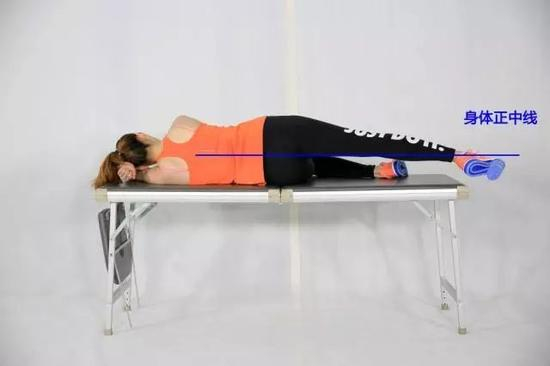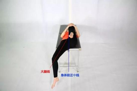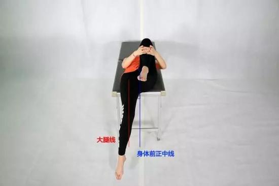 髂胫束紧张度正常时,上腿可下落至身体正中线以下。