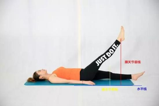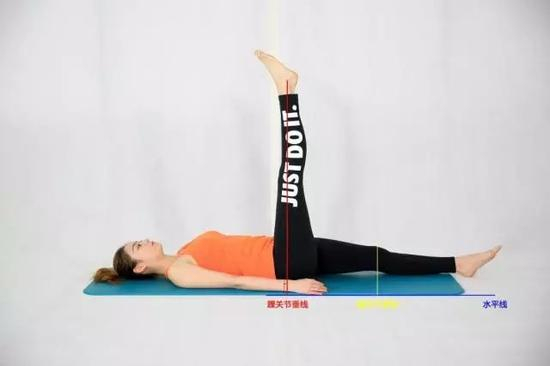 测试方法:仰卧于瑜伽垫上,伸直膝盖,上抬整个下肢至最大幅度。