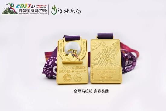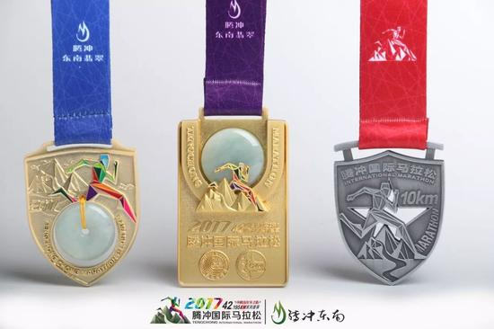 腾冲是最接近缅甸翡翠原产地的地方,加工、经营翡翠的历史已有600多年,2015年被亚洲珠宝联合会授予“中国翡翠第一城”的称号。腾马的完赛奖牌代表着跑者的无上荣誉,2017腾马的奖牌延续经典,使用顶级珠宝材料翡翠打造全马、半马完赛奖牌。传统的翡翠加工工艺,结合腾马的英雄主题,打造具有腾冲文化底蕴和创新精神的奖牌。其中半马奖牌与10公里路跑奖牌设计灵感取自于抗战期间中国远征军 CBI战区臂章造型,寓意着向70多年前可歌可泣的民族英雄致敬。精心的设计、匠人的打磨,翡翠光泽的加持,让腾马的翡翠奖牌一经发布,便刷爆朋友圈,成为所有跑者热议和追捧的话题。