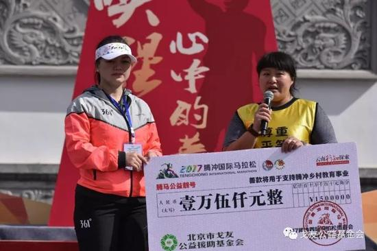 2016年腾马推出110个公益靓号,可任意选择半程马拉松、十一公里路跑及五公里欢乐跑,每席800元。每位公益靓号的购买者将获得2016年腾冲国际半程马拉松公益专属号码布。公益靓号在推出27天后,110个公益靓号全部售罄,共筹得善款88000元,赛事结束后,腾马组委会联合腾冲教育局、北京戈友基金会走进腾冲当地贫困学生家庭,所筹得的善款捐助给每一位需要帮助的学生。