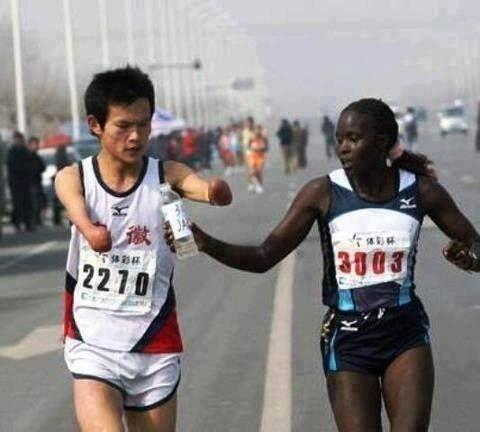10月15日,2017池州马拉松鸣枪起跑,赛后,一组外籍女选手为中国断臂跑者递水的照片开始在网络传开。被递水的跑者叫任耀,这一幕曾在2010年的郑开马拉松中上演过。