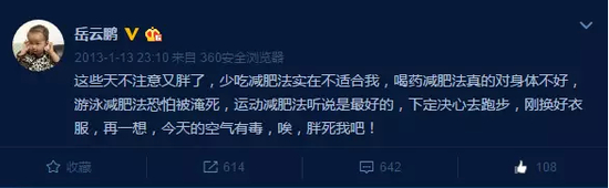 决定减肥后,小岳岳首先想到的不是跑步,而是节食这条“捷径”。然而并没有什么卵用。小岳岳也很快地醒悟过来:“少吃减肥法实在不适合我,喝药减肥法真的对身体不好,运动减肥法听说是最好的,但游泳恐怕被淹死,于是下定决心去跑步!”