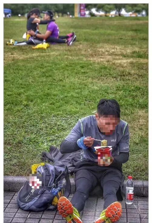 南京马拉松赛后,一位跑者默默的坐在地上吃泡面,没想到被身后一对缠绵的情侣跑者抢了镜头,顿显凄凉。赛后,南京跑团的跑友表示,男主角是一位严肃跑者,并且有个幸福的家庭。跑友:以后千万别惹摄影师。