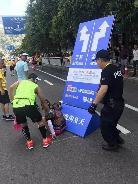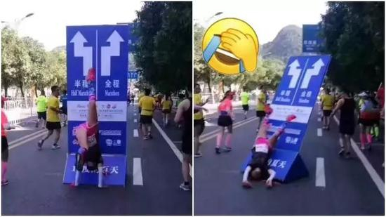 7月的六盘水马拉松赛中,一位女跑者来到全程和半程的分流处,本来想在这里拍照留个念,转念一想,不如来个倒立,可万万没想到,指示牌的固定并不牢靠,女跑者也因此摔在地上,引得围观的跑友哄堂大笑。