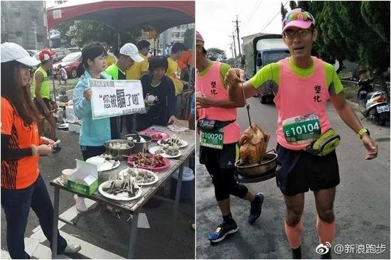 12月初,台湾云林举办的一场马拉松,全程设有15个补给站,牛肉、水饺、烤鸡、啤酒…这是把美食街搬到了现场!有一位跑者脚抽筋了,想慢慢走,补给站硬塞给她一只烤鸡,她就拎着这只鸡,跑完了比赛。