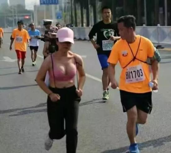 无独有偶,这一幕去年曾经也发生过,一位妹子由于没有穿着合适的运动Bra,结果在赛道中“波涛汹涌”,引来众多回头者。