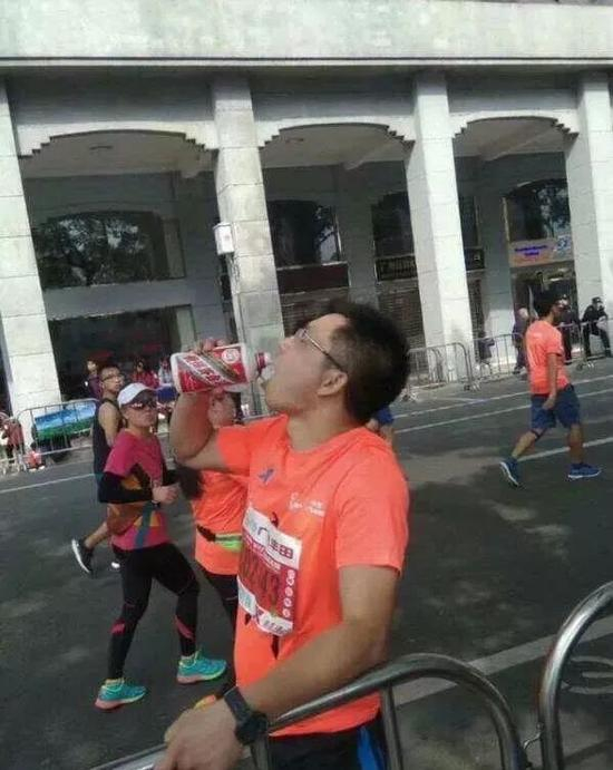 鲁迅还说过:烟酒不分家!所以,在同为奔跑中国系列赛的广州马拉松赛中,有位跑者直接拿起国酒茅台,几口下肚神清气爽,最后可能是喝醉了,完赛成绩未知。