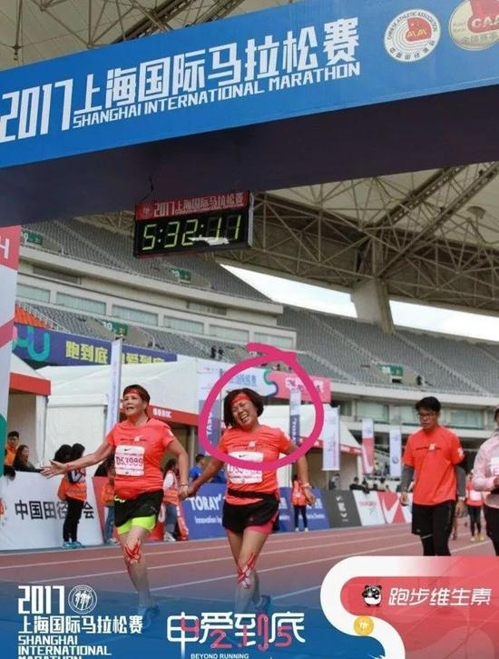 上海马拉松赛中,一位D区的女跑者硬生生的挤到精英选手区域出发,本以为她要一举冲进300。但是从赛后的照片中可以看出,她在同伴的陪同下,表情狰狞的冲过了终点,最后的完赛时间是。。。。。。5小时32分,真是扎了心了!!