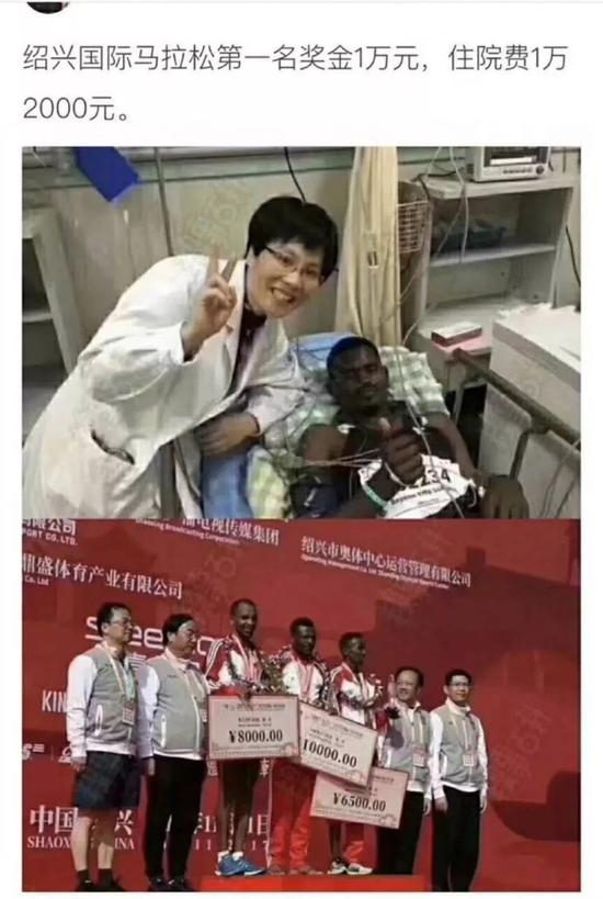 绍兴马拉松赛后,有媒体报道冠军选手身体不适住院治疗,医疗费要花掉1万2千元,而他的比赛奖金只有1万元,辛辛苦苦跑完马拉松,结果还要倒贴2千,机智的跑友表示:没看到医生的手势吗?多了两千!