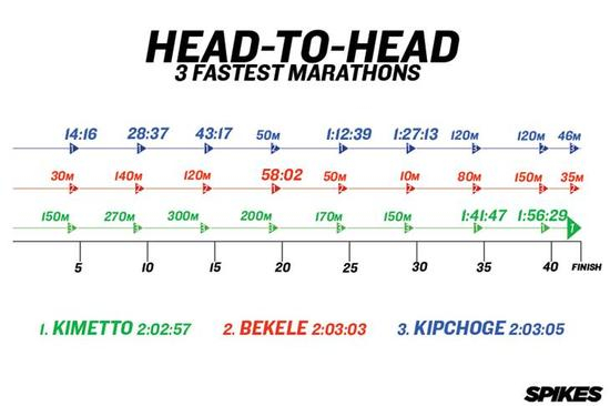 从三个人的对比可以看出,贝克勒和基普乔格前半程跑得相对快了。15公里之前,基梅托一直压着速度,而他们三个最终决胜的关键在于30公里到35公里处,基梅托飚出了2分49秒的配速,这也是三人的所有分段配速中最快的5公里。