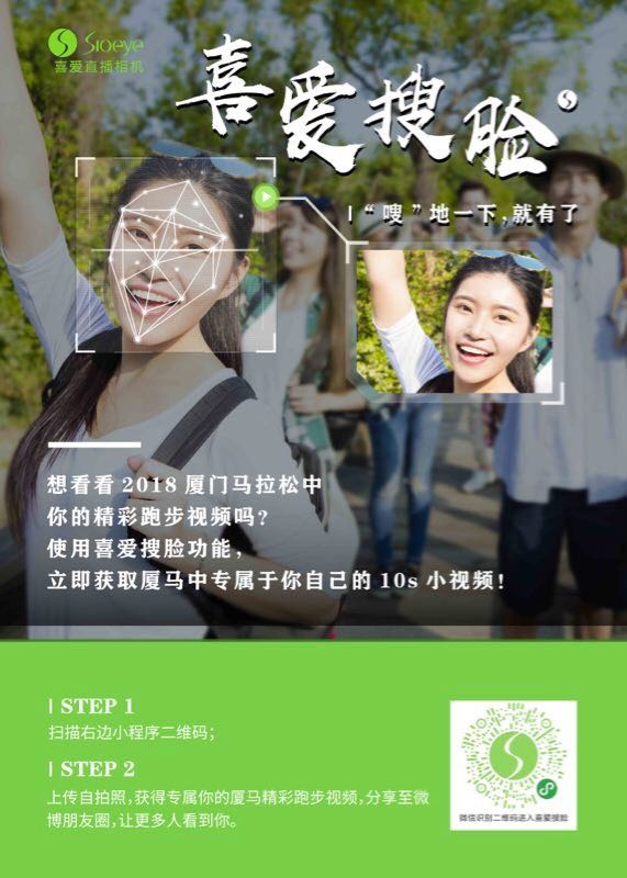 本次厦门马拉松,Sioeye喜爱直播相机将在赛道沿途设置大量的机位,跑者赛道上发现直播点后可以主动上前去打招呼,让镜头记录下你奔跑的瞬间。赛后,你可以通过扫描上图的二维码进入微信小程序,通过人脸识别功能找到自己的视频,然后就能免费获取厦马赛道上你的专属视频了。