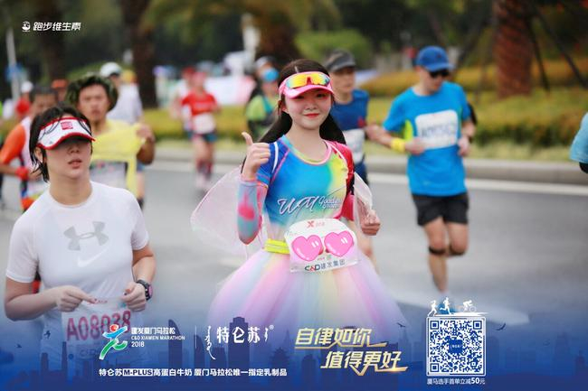 除了专业拍照组,也有认真跑马组,看这位女神跑的多专注啊,全程低着头,仔细再看妹子外面穿着厦马官方参赛服,里面还不忘穿上女神彩虹格子服和炫彩裤子,看来是女神团的真爱了