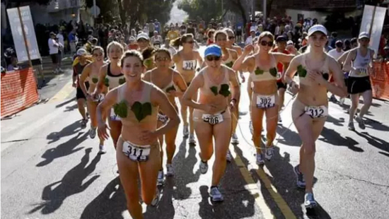 这里除了是世界上规模最大的跑步比赛(1986年参赛人数11万)外,还是裸体爱好者的盛宴。由于当地政府禁止在平日里裸体出街,因而每年一度的越湾长跑给了广大裸体爱好者们一个合法的上街机会。当然除了不穿衣服的,那些穿衣服的人们也会打扮的花枝招展来迎接这场全城最热烈的狂欢盛宴。