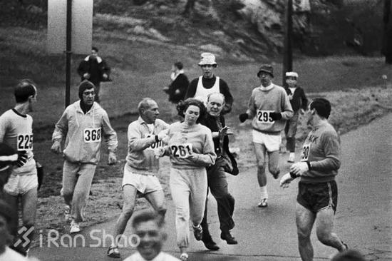 1967年有2名女性参加了波士顿马拉松赛,其中斯威策(Kathrine V。 Switzer,号码布261号)被赛事总监森普尔(Jock Semple)推搡的情景被拍摄并被流传出来。