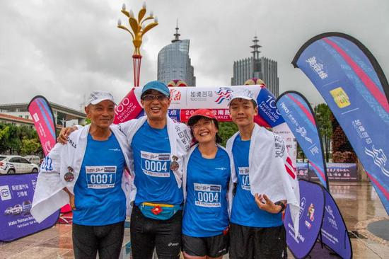 信跃升、孙嘉鸿夫妇是跑圈非常知名的夫妻跑者,也是打破777(七天七大洲七个马拉松)吉尼斯纪录的跑者。孙嘉鸿还创立了跑族,一直活跃在马拉松赛场。7日,阿信夫妇携5个儿女,不远千里前来临沧助阵。其中,二公子完成了自己首个公路全马,最小的女儿完成了3K,老三跑完5K,老四则实现赛前目标:半马。