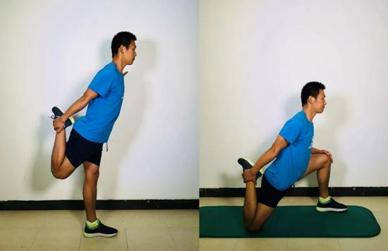 ⏩ 这是一个非常基础的拉伸动作,主要拉伸大腿前侧股四头肌,对于缓解膝前痛有一定帮助。一般可以采用如下图所示动作进行拉伸,如果拉伸感不强烈,则可以采用跪姿方式进行。