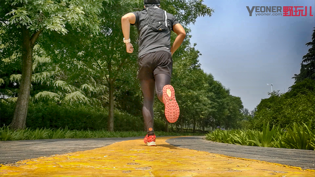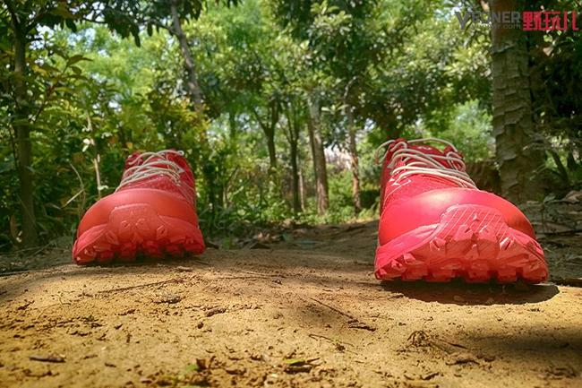 探路者大红鞋整体感觉非常轻盈,完全没有笔者另一款越野鞋沉重的感觉,真的很惊喜。单只300克的重量和普通的缓震系跑鞋类似,但跑起来没有缓震系跑鞋常有的拖沓感,也就是会不自主的出现后跟着地的那种感觉。探路者大红鞋跑动起来利用前掌发力非常自然,后掌落地时缓冲非常充分,脚掌的缓冲是这双鞋体验时最为明显的感觉。