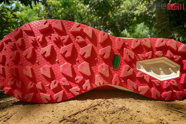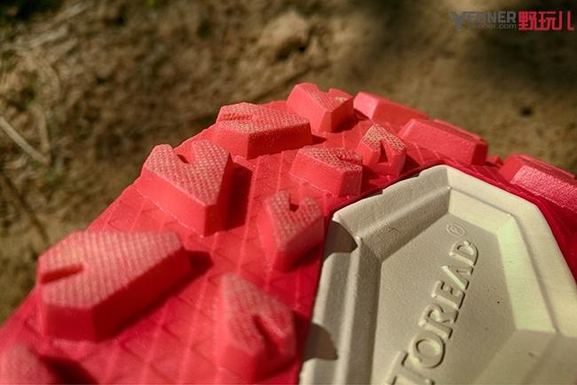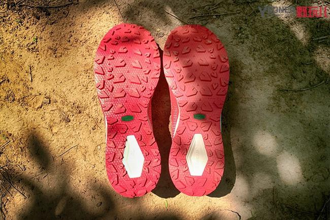 探路者大红鞋的大底上,齿耳以类似“锥形”呈现,这也是这款跑鞋设计的一大亮点。大齿厚度约4mm,十分强调更为复杂环境下的防滑表现,不仅提升鞋底在湿滑路面的摩擦力,同时又能保护耐磨性,即使碎石路也轻松应对。