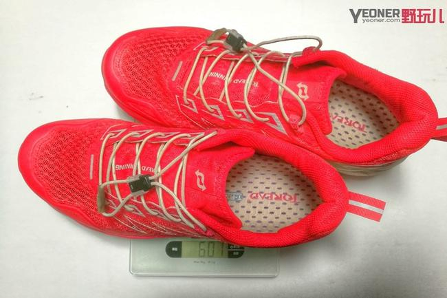 笔者评测这款探路者2018大红越野跑是41码的,由于每个测量者水平的差异和所用设备精准度的差异方面问题,和官方数据可能会有所出入,所以图片所有数据仅供产考。经过测量,整双鞋重量为601克,单只不300克,属于“轻灵体型”。