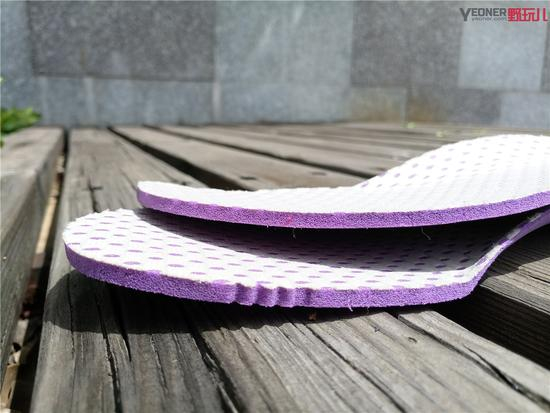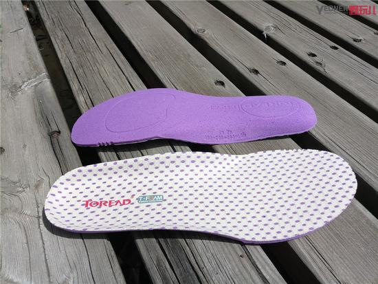 在鞋垫的选用上,探路者还是非常有诚意的。从这对紫色的泡棉鞋垫就可以看出来,泡棉鞋垫的质感与舒适度要高于EVA鞋垫许多,且成本也要高的多。厚度还算不错,能够增加一定的缓震感。但最主要的还是与双脚接触的第一感觉会很赞!