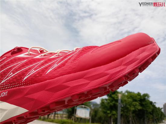 跑鞋的中底Flight科技是大红鞋最强大的科技。将生鸡蛋用力砸向Flight材料上,鸡蛋居然毫发无损!且回弹上升高达10.5米!可以最大程度吸收跑步时所产生的震动,让跑步膝、髌骨劳损等损伤统统远离你!