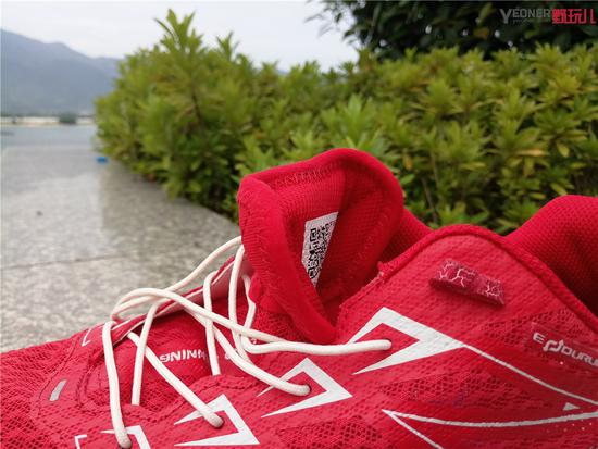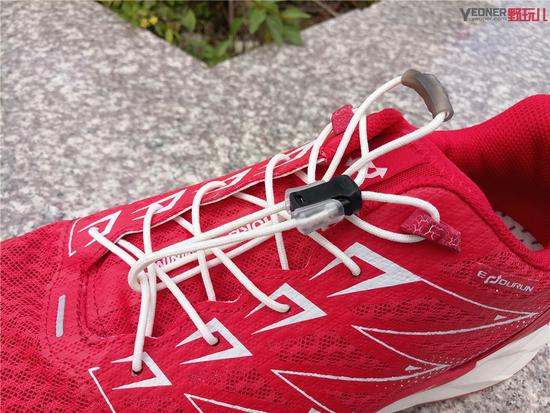 大红跑的鞋带系统可以说是这双跑鞋的一大核心科技,鞋带本身是属于比较硬的类型,没有弹性。在与鞋带扣配合使用后能够获得最佳的体验。即使在黑乎乎的夜晚,也能够轻松的系好鞋带。不用绑复杂的马拉松结,也不用担心蝴蝶结会掉了。可以说是相当不错的设计,如果鞋带要是稍稍有些弹性,质感会更好一些。
