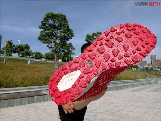 在公园瓷砖路面上奔跑的感觉还是不错的,一开始我以为这样复杂的大底橡胶可能会觉得有些突兀。但是跑起来以后,完全没有。与一般跑鞋几乎一样,我想是因为大底凸起的橡胶大部分都处于同一平面的原因吧!在公园与柏油路面测试了一段5KM的短距离慢跑,体验不错,抓地力很强。同时,缓震感是没的说,真的非常软弹。