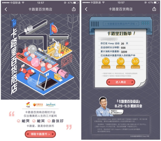 这是一家定义为“出售美好人生”的商店,8月29日-9月9日在上海大悦城北座三层中庭限时开放。活动期间,用户可以通过参与现场“拉伸握力绳”、“夏威夷减压跑”及“烤鸡杠铃举重”等趣味互动,在各个专柜领取Keep发行的“卡路里货币”,并在出口的兑换区,换取价值不等的实体运动礼品。消耗的卡路里越多,获得的礼品就越丰厚。线上版“卡路里百货商店”也于Keep App同步上线,供无法亲临现场的顾客“购物”与挑选。