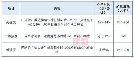 3、绝大多数游泳者的强度为上表第三行的“低强度”,即:慢速的“抬头蛙”或者每小时1000米到1500米自由泳,达不到有氧最佳燃脂心率,减脂肪效果不明显,类似散步一小时。