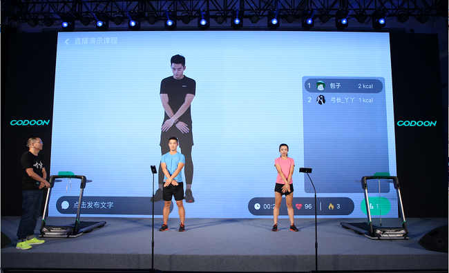 运动达人董的和郭彦虎现场演示了CODOON LIVE的互动式健身课程和跑步机课程,锻炼过程中,亲身感受了CODOON LIVE教练对学员心率动作等数据进行的实时监测,语音实时互动指导、及时纠正不规范的动作,通过语音和教练沟通,并观看自己的运动数据和分析结果。