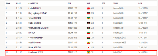 放心,小编没有写错,这个不是刚刚在柏林马拉松上获得女子第三的迪巴巴,这个迪巴巴虽然不是迪巴巴家族的一员,但是能叫迪巴巴的都跑的非常 快。1993年出生,特别钟爱日本东京马拉松,连续5年,每年必跑,成绩也很不错,是2015年和2018年冠军,2014年和2017年第二,2016年第五,此外也拿过2016年柏林马拉松冠军,2015年芝加哥马拉松第三名,世界排名24!