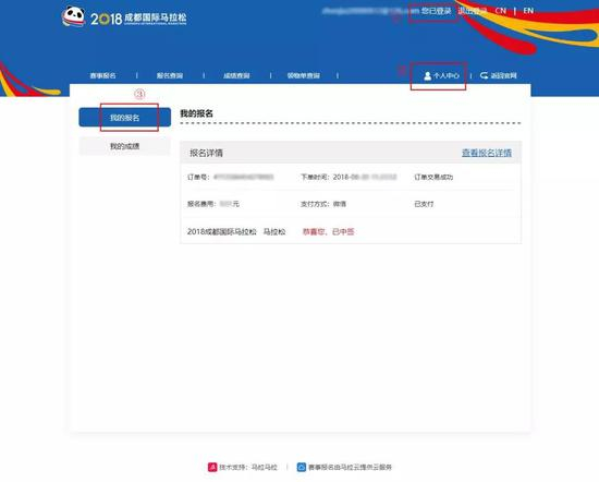 方法二:进入成都国际马拉松官网使用报名时所注册账号登录,进入“个人中心”页面,再点击左侧的“我的报名”,即可查询中签状态。