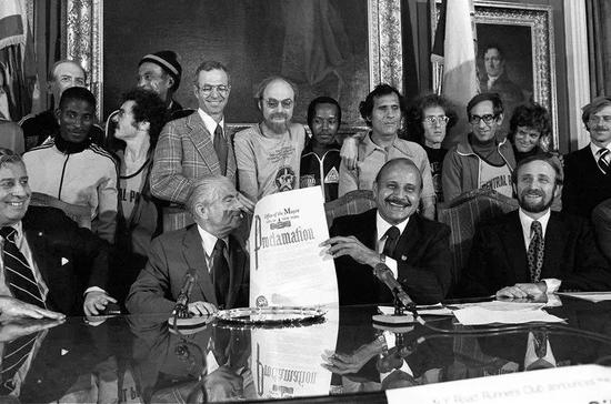 纽约市市长Abe Beame,曼哈顿区区长Percy Sutton和纽约路跑协会主席勒博庆祝该市于1976年10月举行的纽约市马拉松比赛。图片来源纽约路跑协会官网