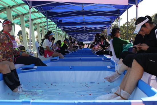 主办方还为选手准备了玫瑰花冰水脚部修复池,佰仂运动康复中心为完赛选手提供赛后拉伸,浙江省康复医学会做运动康复咨询。