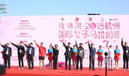 玫琳凯2018杭州国际女子马拉松由中国田径协会、杭州市体育总会、杭州经济技术开发区管委会主办,由杭州市长跑运动协会、浙江午马体育文化策划有限公司、杭州星推网络科技股份有限公司承办。杭州市人民政府副市长陈国妹,杭州经济技术开发区党工委书记、管委会主任邵立春,玫琳凯公司亚太总裁蔡庆国,浙江省马拉松及路跑协会会长龙江,杭州市体育局副局长丁烔,杭州经济技术开发区党工委委员、管委会副主任何铨寿,杭州市体育总会常务副秘书长张玮,杭州经济技术开发区党工委、管委会办公室主任袁月,杭州经济技术开发区教育工委书记、社发局局长钱晓华,杭州市长跑运动协会会长、午马体育董事长赵青松,出席了本次比赛开幕式,并为赛事起跑鸣枪。