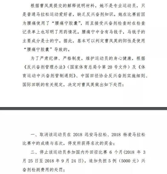 6月21日,中国反兴奋剂中心在官网更新了一批违规信息:2018远安田野马拉松女子全程第三名曹凤英使用了违禁药物士的宁。此后曹凤英被禁赛6个月(2018年3月25日-9月24日)。
