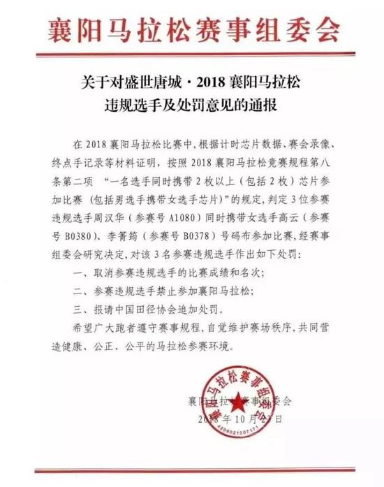 10月24日,襄阳马拉松组委会开出罚单,违规选手周汉华同时携带另外2个女性参赛者芯片参加比赛,组委会对三名违规选手做出以下处罚:1 取消比赛名次和成绩;2 禁止参加襄阳马拉松;3 申报田协追加处罚。