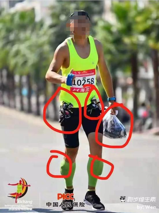 这几张应该是最近跑圈最火的照片了。11月3日,参加西昌马拉松的一名男选手,腿套里,腰包上,背包上,装满了赛道上的能量补给,而且对自己这种行为毫无羞耻之心,还发朋友圈得瑟,照片被传开后迅速遭到众跑友的谴责,有跑友说:太无耻了,丢了跑马人的脸。