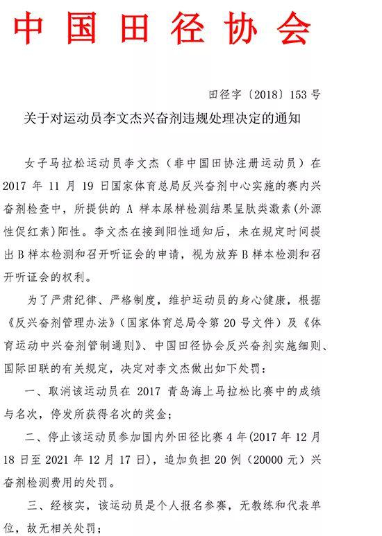 同样今年1月5日,马拉松女神李文杰兴奋剂违规在跑圈引起轩然大波,还有曾任省级马拉松队助理教练侯艳民也引起广泛关注。6月25日下午,中国田协发布了两篇兴奋剂事件处罚通知,对李文杰、侯艳民禁赛4年。