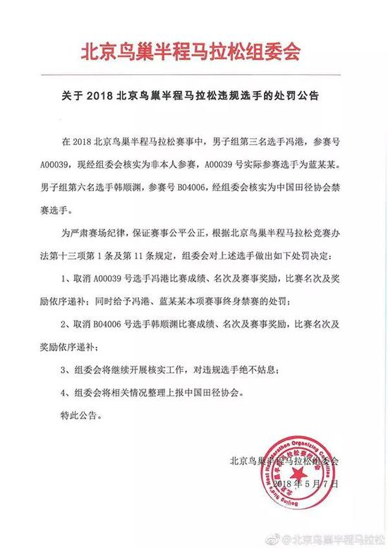 今年鸟巢半马重罚第三名替跑选手,取消成绩终身禁赛,其中就包括男子季军。