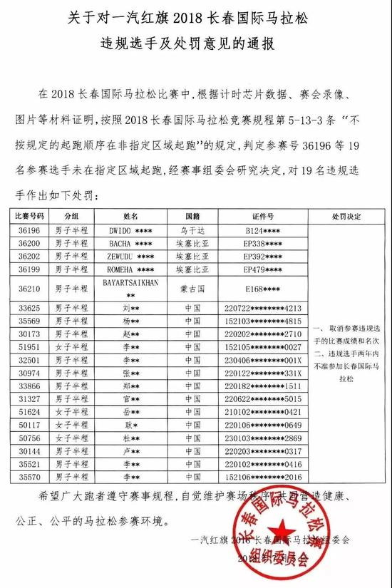 7月13日,长春马拉松组委会也对19名违规选手进行处罚:取消成绩,并全部禁赛两年。其中,包含4名黑人选手,1名蒙古选手,半马组男女季军双双被处罚。