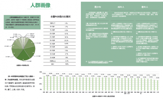 城市体力活动中,年轻化、中心化成为明显趋势。所有的运动人群中,25-40岁群体超过了总人数的一半;而在所有的运动城市中,中心城市的体力活动也要比周边城市更为旺盛,这也使得年轻人口比例更大的中心城市成为健康城市的重要基石。