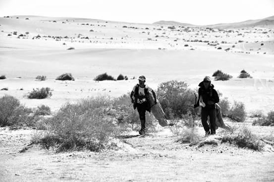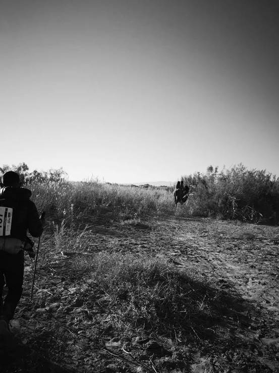 睡醒后,全身僵硬酸疼的使动作迟缓了很多。然后迈出一步步小碎步活动开身体往前走,走着走着泪流了下来,不自觉的流了下来,腿部的疼痛越来越严重,听着梁在那说话,我只好低头不语,总不能跟他说我哭了吧,茫茫戈壁滩上,两人就这么三四十分钟一公里走着,有个人还眼中带泪,想想就想笑。这无疑是我们参赛这么久走的最慢的一回,赛前准备的不妥当,多吃苦是避免不了的。