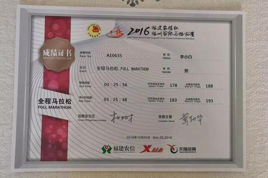 2016年12月25日福州马拉松,李小白第一次PB时间达到了3小时25分38秒,他当时不敢相信,便决心说,“在同一个成绩上,要是能跑到3次,我才敢确认自己能够跑到这个成绩。”