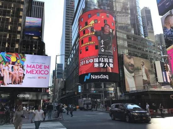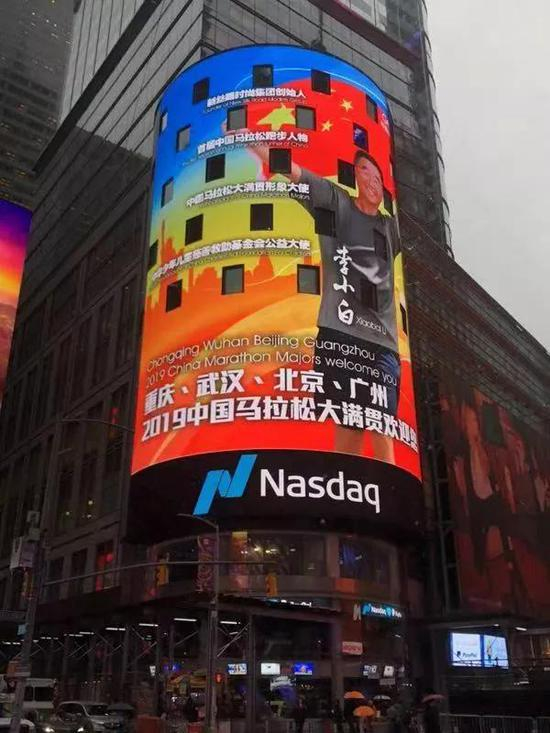 李小白的跑马故事可以说讲得非常成功。2018年国庆期间,他身披国旗,以马拉松跑者的身份登陆纽约时代广场纳斯达克的大屏。