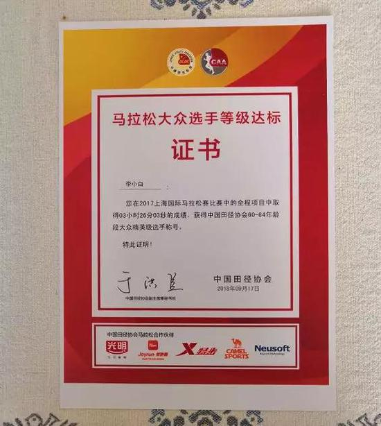 李小白,可能不是跑马选手中年龄最大的、不是PB成绩最好的,但在同龄人中,他已然是佼佼者。2018年9月,他获得了60—64年龄段大众精英选手称号。